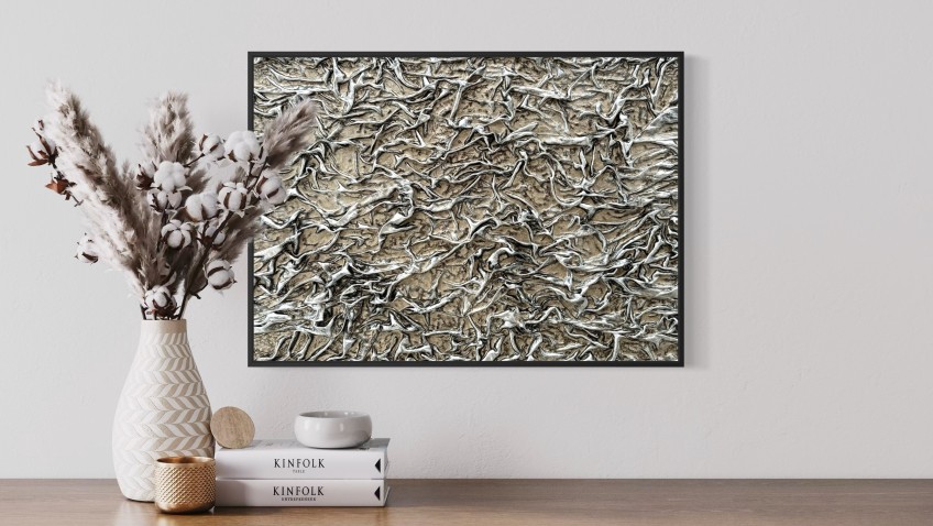 Utforska styrka och rörelse i en abstrakt tavla med metalliska toner.